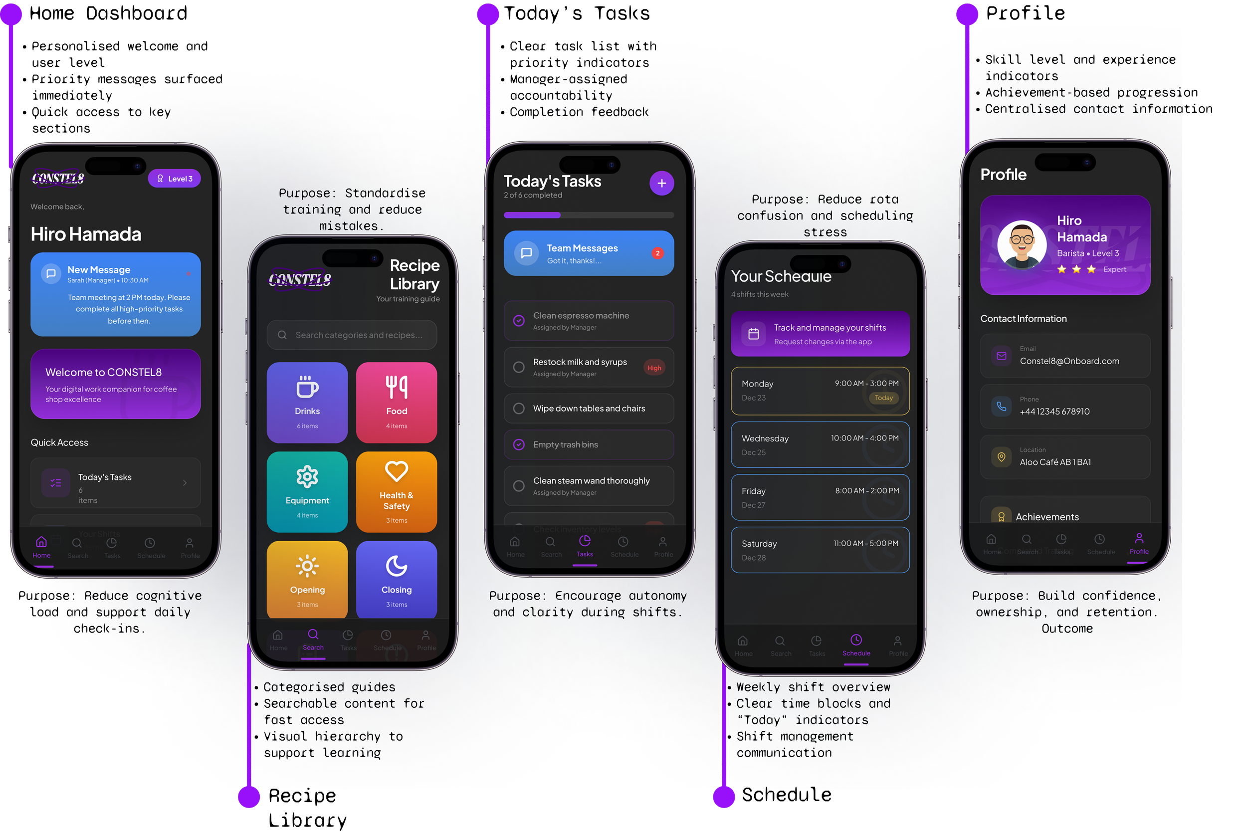 The user flow centres on a new coffee shop employee, focusing on the main journey from login to completing daily tasks. Secondary actions are kept minimal to maintain clarity.
